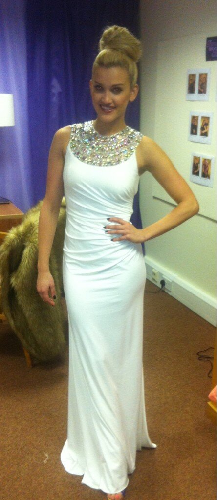 Ashley Roberts' Forever Unique Agatha White Sleeveless Ruched Drape Front Jersey Maxi Dress With Clear & Multicoloured Hand Sewn Bead & Gem Embellished Neckline & Cut Out Back Detail You can view Ashley in her glamorous maxi dress with hand embellished neck piece here.You can buy Ashley's dress here from the Forever Unique website.Item image via Forever Unique.