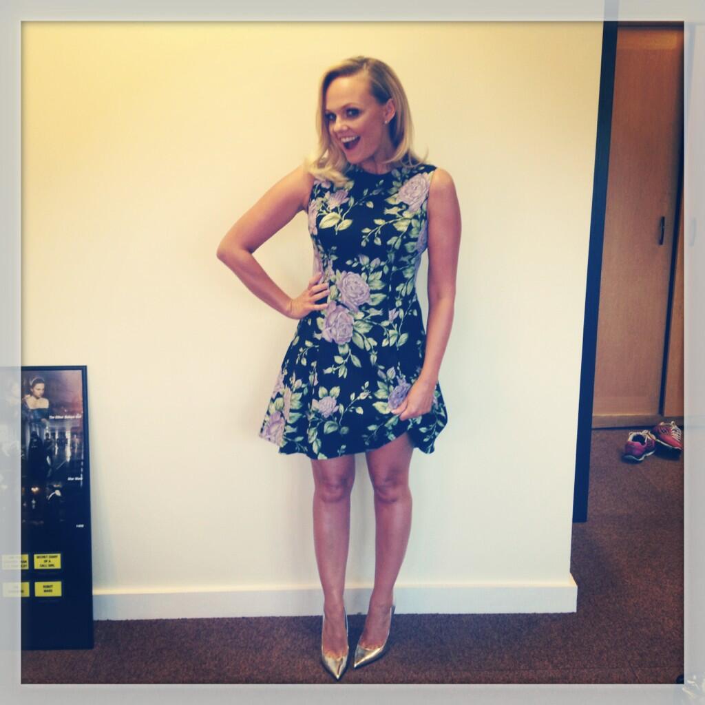 Emma Bunton's Rag & Bone Ruby Navy Blue, Lilac Purple & Green All Over Oversized Rose Floral Print Sleeveless Round Neck Tailored A-Line Fit & Flare Dress You can view Emma in her beautiful & feminine rose print dress here.You can buy Emma's dress here from the Matches Fashion website.Item image via Matches.