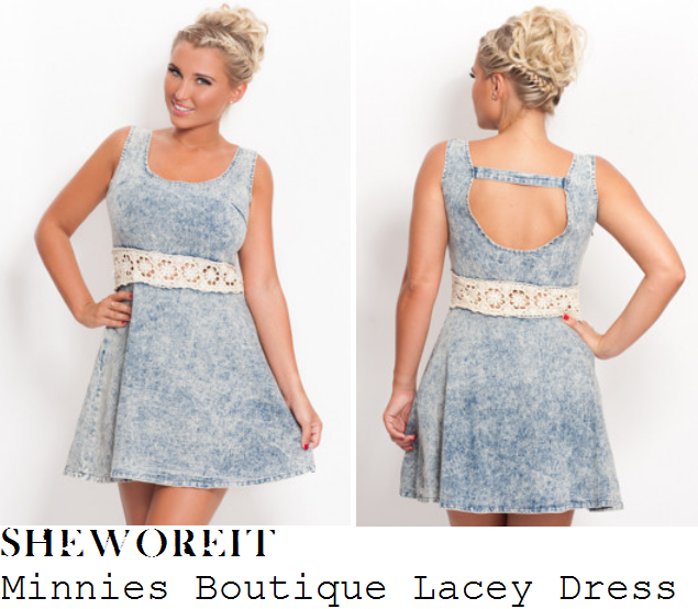 Billie Faiers' Minnies Boutique Lacey Light Acid Wash Stonewash Denim & Contrast Cream Crochet Lace Floral Cut Out Waistband Sleeveless Scoop Neck Skater Dress With Cut Out Open Back You can view Billie in her cool acid wash & lace detail dress here.You can buy Billie's dress here from the Minnies Boutique website.Item image via Minnies Boutique.